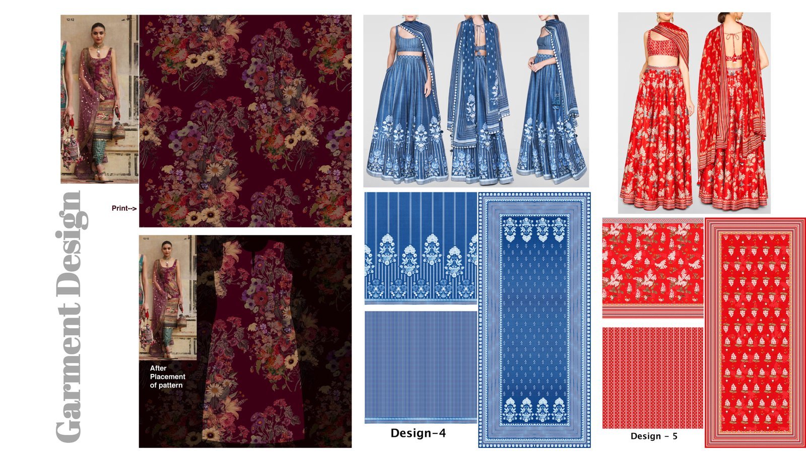 You will practice designing for Indian wear such as Saris, Lehengas, Blouses, Dupattas, Indian Suits, running fabric prints, and customised placement print designs.